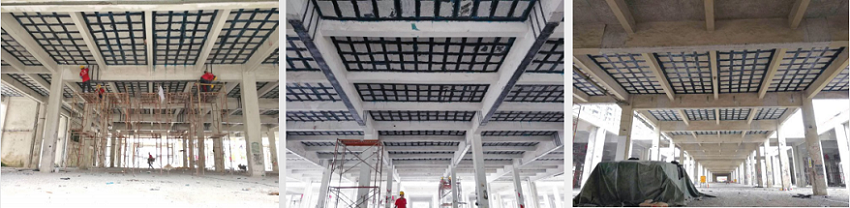 加固內(nèi)容:對(duì)該建筑進(jìn)行加固改造,根據(jù)設(shè)計(jì)圖紙對(duì)該建筑的柱、梁采用加大截面的方式進(jìn)行加固,部分梁采用粘貼鋼板的方式進(jìn)行加固,部分樓板有裂縫采用灌注環(huán)氧樹脂進(jìn)行修補(bǔ),整體樓板采用粘貼碳纖維布的方式加固。