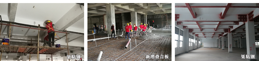 加固內(nèi)容:根據(jù)相關(guān)檢測(cè)報(bào)告與設(shè)計(jì)圖紙,對(duì)其進(jìn)行新增疊合板、梁粘鋼等加固工藝。